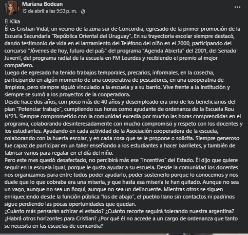 El testimonio que acompaña la publicación viral cuestiona la falta de oportunidades para personas comprometidas con su comunidad y plantea interrogantes que resuenan en la sociedad: el alcance de los recortes del Estado, las prioridades en la asignación de recursos y la ausencia de respuestas concretas para quienes, como Vidal, buscan una inserción laboral estable.