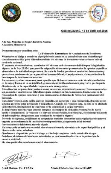 La Federación Entrerriana de Asociaciones de Bomberos Voluntarios expresó su preocupación por la falta de transferencia de recursos previstos por ley y solicitó al Gobierno nacional la regularización inmediata de los fondos.