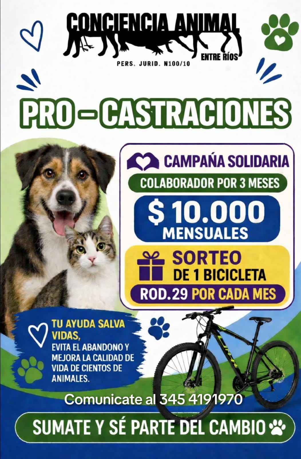 Las personas interesadas en sumarse pueden comunicarse a través de las redes sociales de la organización (@concienciaanimaler) o al número telefónico 345 4191970, donde recibirán más información sobre cómo participar de la campaña.