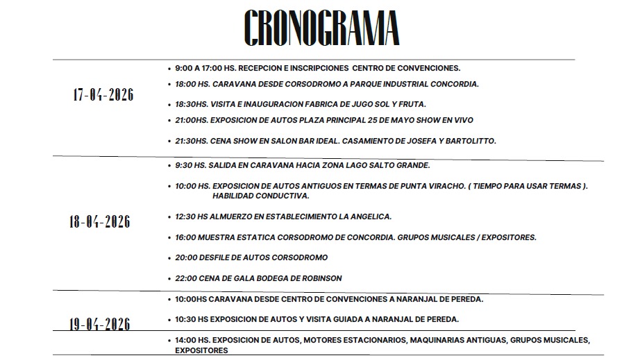 En paralelo, se desarrollará una muestra estática en Plaza 25 de Mayo, ubicada en pleno centro de Concordia, donde vecinos y turistas podrán apreciar de cerca los vehículos y dialogar con sus propietarios. A esto se sumará la actividad permanente en el Corsódromo, uno de los espacios más convocantes de la ciudad, que funcionará como epicentro de gran parte de las actividades.