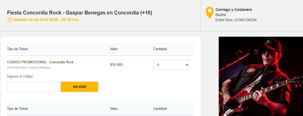 En la jornada de este lunes se confirmó que el guitarrista y cantante Gaspar Benegas se presentará en la ciudad de Concordia con un recital programado para el sábado 18 de abril. El espectáculo tendrá lugar en el predio Budha Zen, ubicado en la Costanera de la ciudad, con horario de inicio previsto —en principio— a partir de las 23:30 horas.