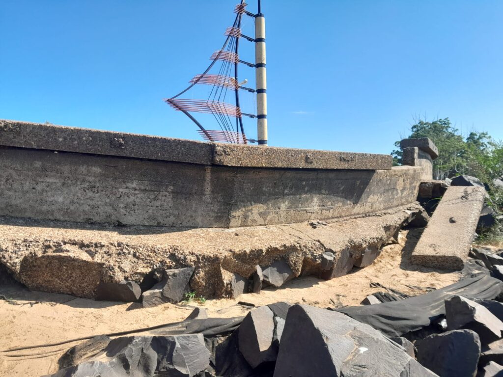 Las imágenes relevadas corresponden al espigón uno de la costanera local, ubicado en el sector que divide Playa Los Sauces de Arenitas Blancas. En ese punto se observa claramente el deterioro del suelo y el desplazamiento de las placas, lo que evidencia un proceso de desgaste estructural que podría agravarse si no se toman medidas.