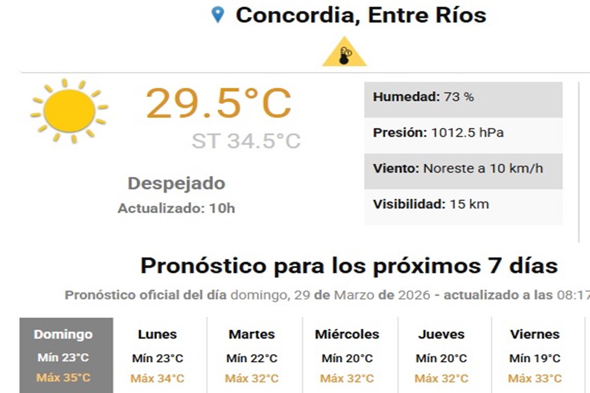 Para este domingo 29 de marzo, se espera una jornada agobiante con una temperatura máxima de 35 grados. De hecho, a media mañana la sensación térmica ya alcanzaba ese valor, anticipando un día sofocante para los concordienses.
